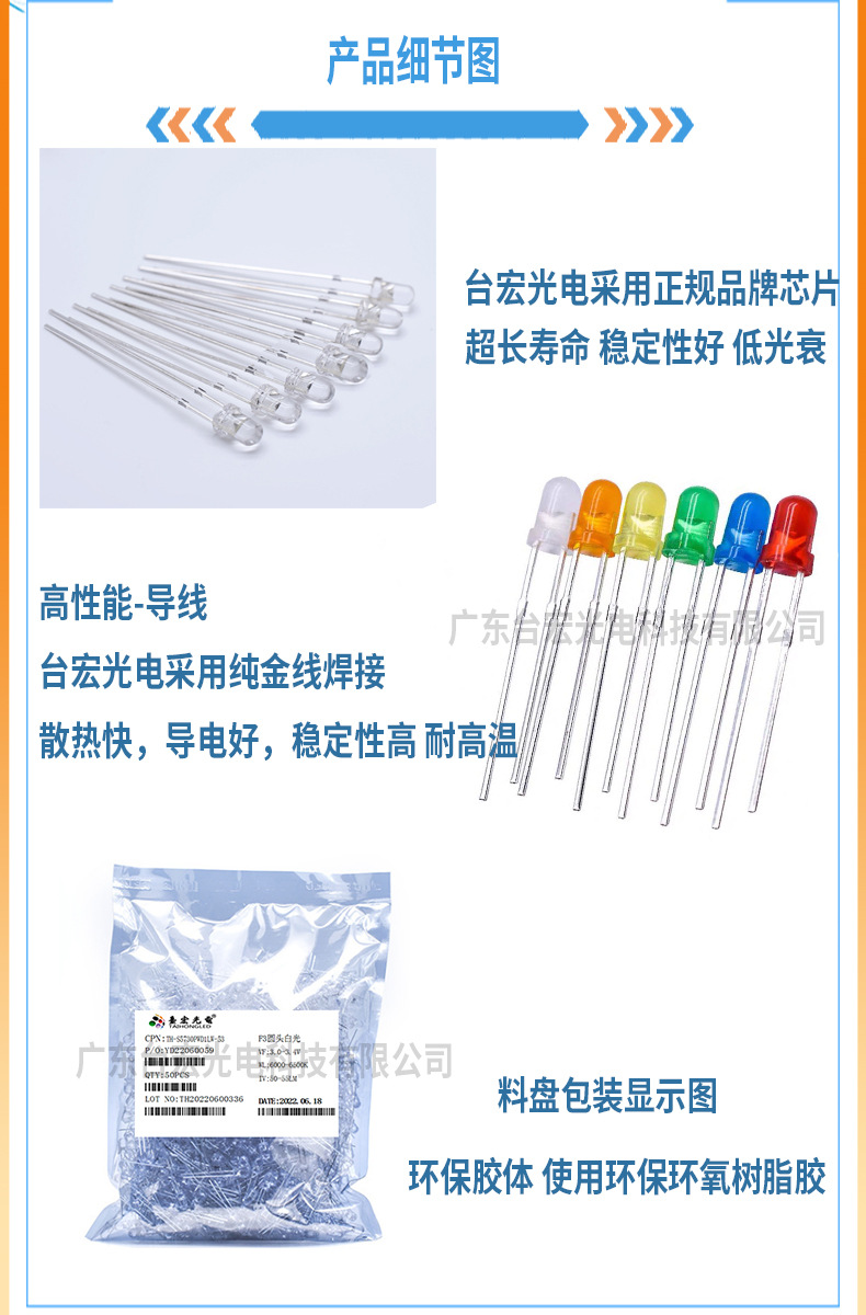 led灯珠3mm 直插灯珠F3mm白发橙光 圆头透明白发橙发光二极管