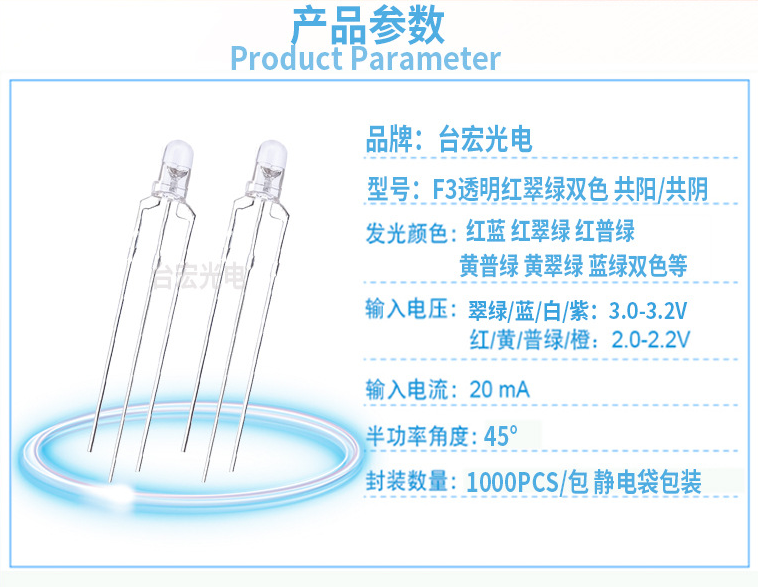 红翠绿双色led灯珠, led直插灯珠f3红翠绿双色, f3圆头三只脚红翠绿双色led灯珠, 红翠绿双色发光二极管, 产品参数: