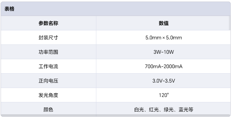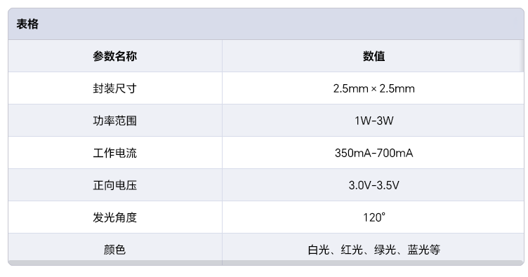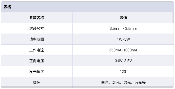 • 功率:1W-3W,适用于中等功率需求的照明场景。