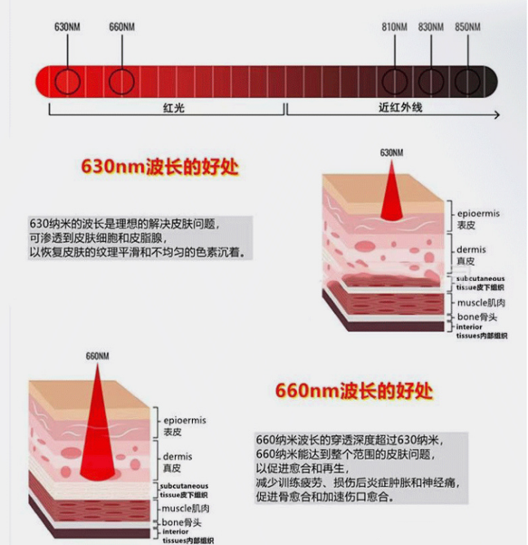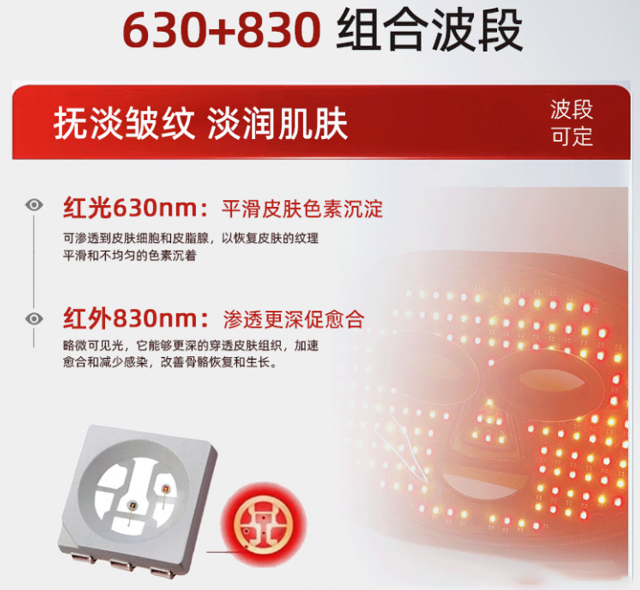 (4)红光:630 nm -640 nm波段主要应用为红色,660 nm -730 nm波段长,主要应用为深红色