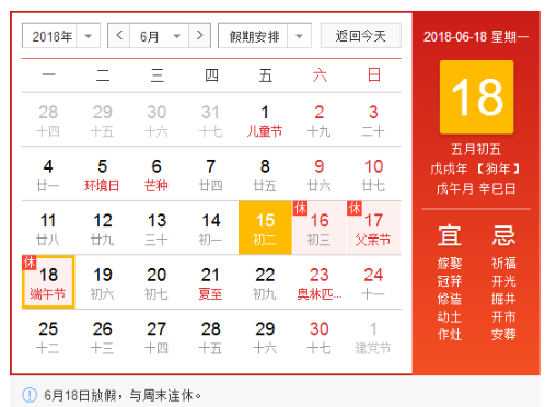 端午节:6月16日至6月18日放假,共3天。 6月19日(星期二)上班。