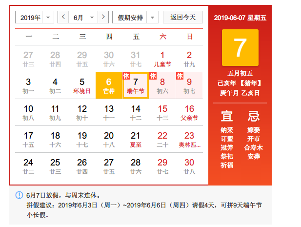 端午节:6月7日至6月9日放假,共3天。 6月10日(星期一)上班。