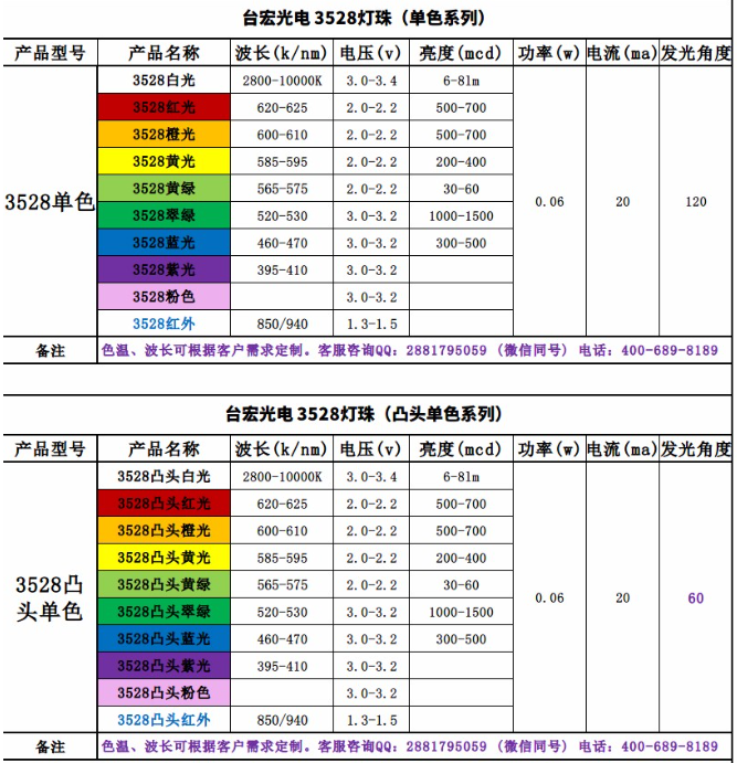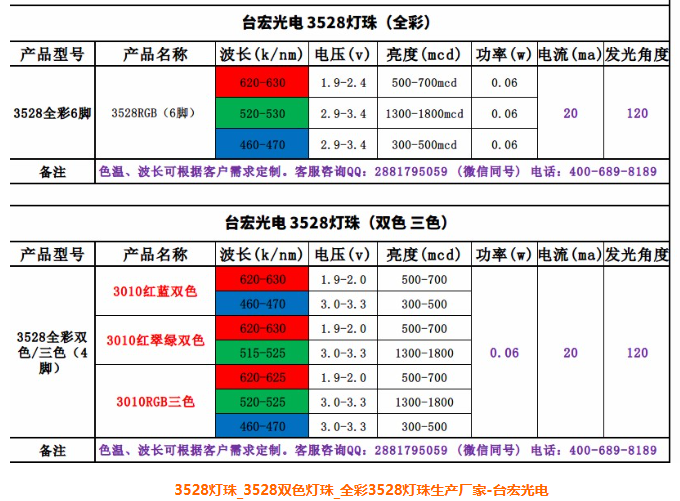 3528灯珠_3528双色灯珠_全彩3528灯珠波长、电压、亮度和功率、电流、电压和发光角度参数图
