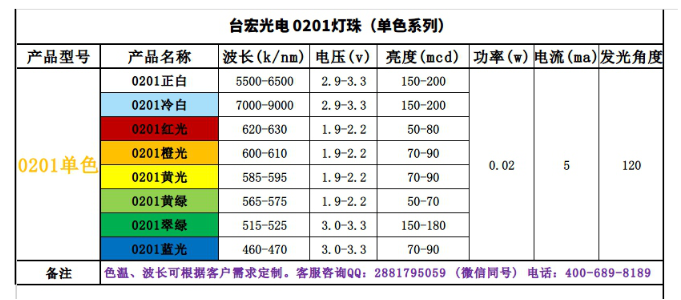 0201彩光系列,具体的规格、波长和亮度(会因为材料不同,而有所不同)。