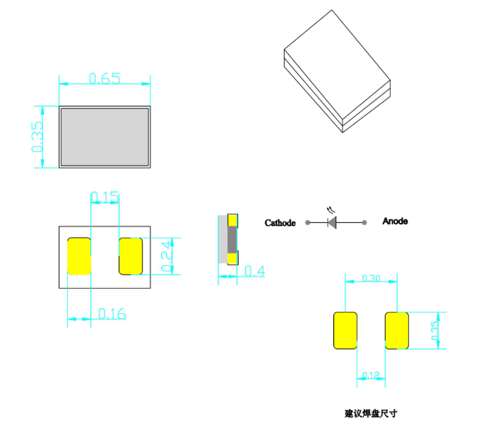 0201灯珠功率为0.02w,包括0201红光,0201绿光,0201蓝光,0201翠绿,0201黄绿,0201黄光,0201橙光,功率都是一样的,使用的电流是5mA,发光角度120度。尺寸图和焊盘图位置如上图。