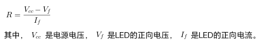 • 计算方法:根据LED的正向电压(Vf)和电源电压(Vcc),选择合适的电阻值。公式为: