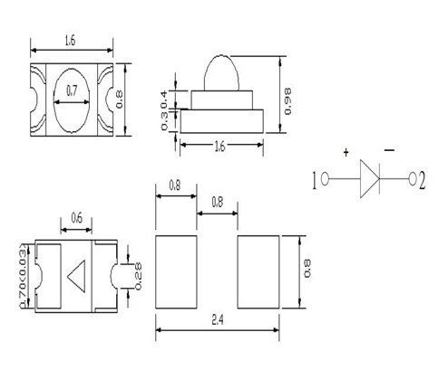 0603灯珠灯珠尺寸:(凸头单色系列尺寸图)