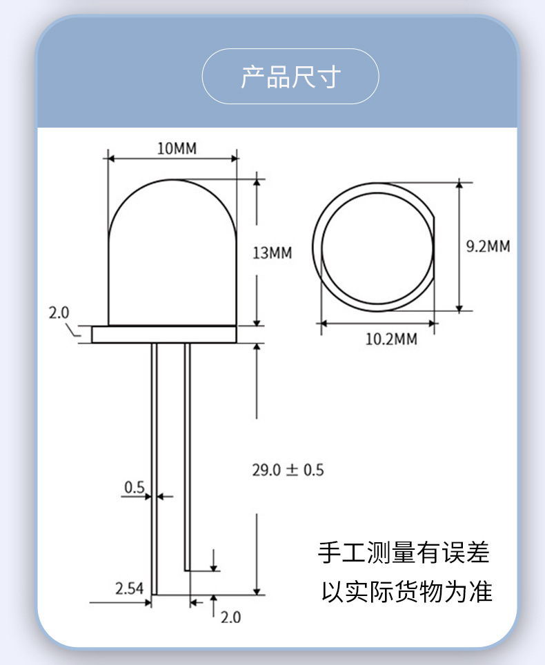 10mm灯珠是指直径为10mm的LED灯珠,具有较大的光发射面积和120度左右的发光角度,可提供更广泛均匀的光线分布,适用于大部分灯具设计。它发光效率较高,品牌灯珠寿命一般可达到50000小时以上,能节约能源并降低维护成本。常用于DIY改装车灯、广告灯箱、交通信号灯、大型显示屏等场景。