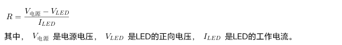 • 限流电阻:在实际应用中,通常需要串联一个限流电阻来控制电流。限流电阻的计算公式为: