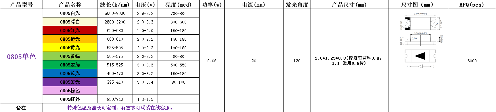 规格书中通常标注“典型电压”(如白光3.2V)和“最大电压”(如3.8V),实际应用中需按最大电压设计驱动电路,避免过压损坏。 - 温度影响: