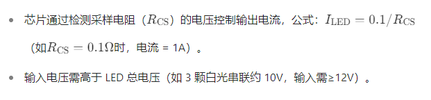 - 电源匹配:驱动电路输入电压需与LED总电压匹配(串联时总电压≤电源电压-芯片压降)。