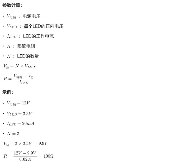 - 适用场景:电源电压较高(如12V、24V),LED数量较少(如3颗白光串联适配12V电源:3×3.3V=9.9V,剩余电压由电阻分担)。