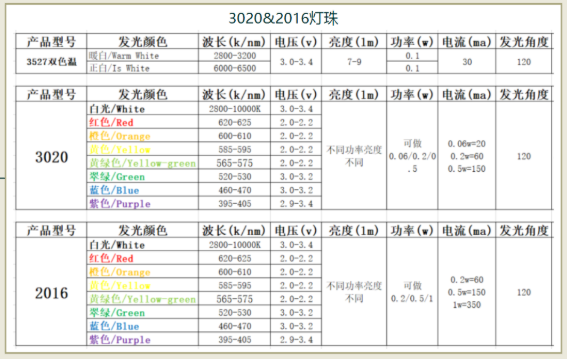 3020&2016贴片led灯珠型号对照表