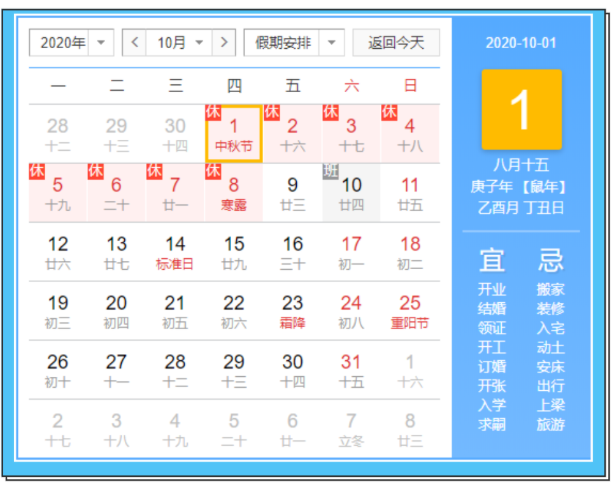 台宏光电公司定于2020年10月1日至2020年10月8日放假,共计8天,2020年10月9日正常上班。其中9月27日(星期日)正常上班。