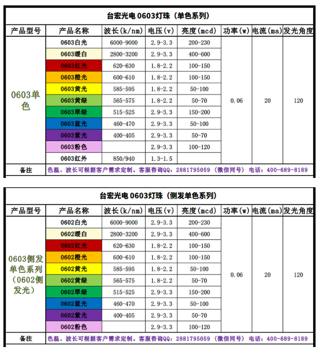 0603灯珠系列:0603白光、0603红光、0603橙光、0603黄光、0603翡翠绿光、0603黄绿光、0603蓝色、0603红绿双色灯珠、0603RGB三色全彩灯珠、0603侧发光珠,这些灯珠应用广泛。