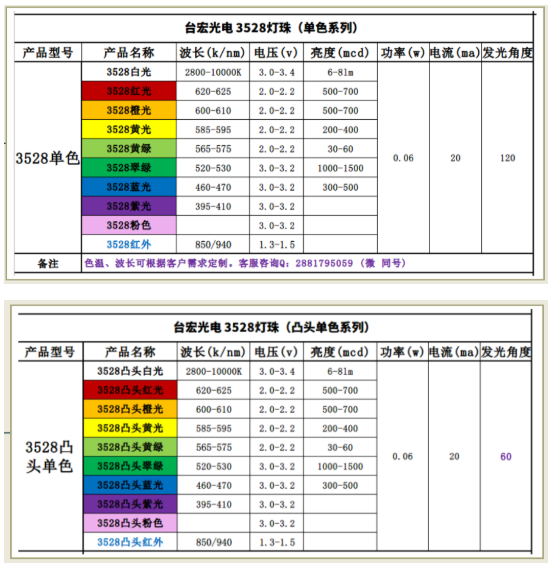 3528贴片led灯珠型号对照表,台宏光电3528贴片发光二极管型号大全