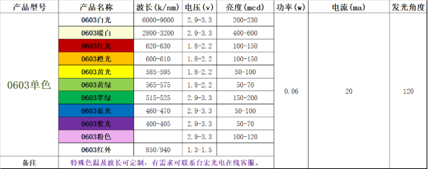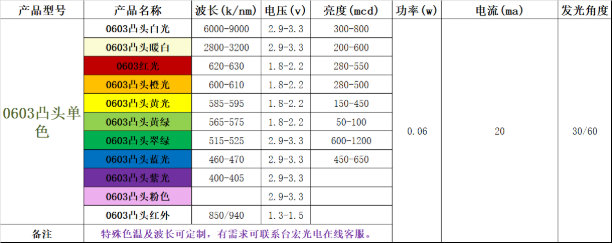 以上,就是0603灯珠规格型号,从上表中,我们也可以看到0603灯珠种类规格很多,种类很丰富。