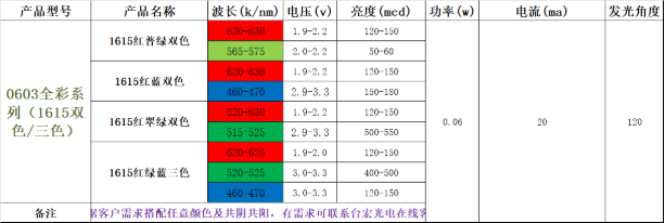 0603双色led灯珠,三色全彩LED灯珠参数:
