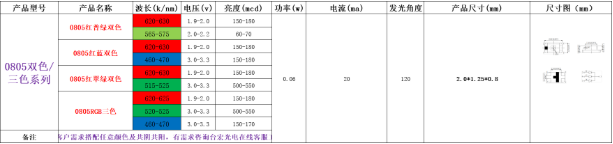 0805灯珠双色、三色全彩RGB灯珠参数:
