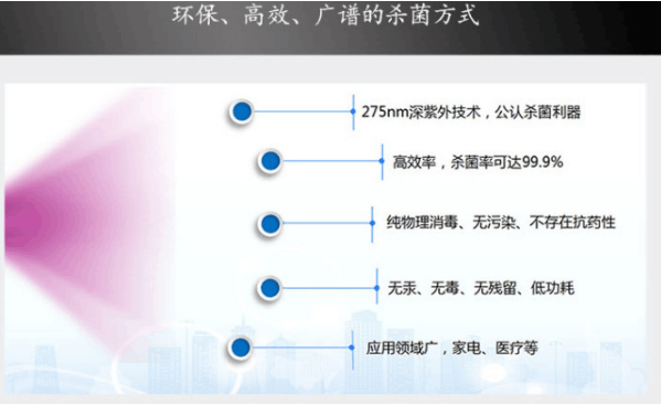 目前,利用深紫外光源最有效的方法是用氯、臭氧等化学方法代替水净化技术。过去,深紫外汞灯中使用的汞是一种剧毒物质,不能用于公共滤水;深紫外LED光源不含汞,解决了输出功率问题,提供了足够强度的深紫外光源,可用于饮用水清洗。同时也开始应用于手机包的杀毒应用。
