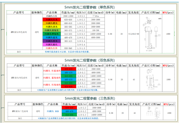 小功率的:如3mm圆形,5mm草帽形、5mm方型、3528贴片灯珠等,约0.06W。