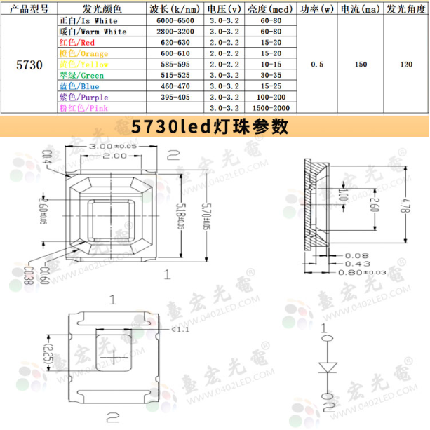 5730灯珠白色光工作电压:3.0-3.3V (包括暖白光,中性白光,正白光和冷白光)
