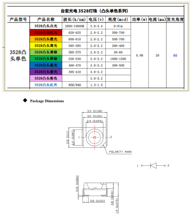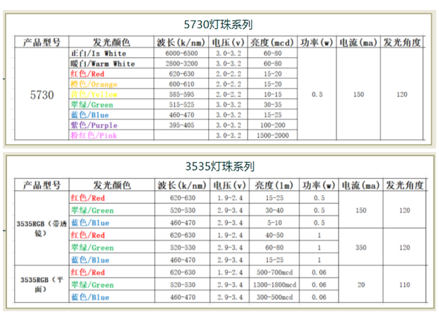 我们来看看具体的贴片led灯珠型号及尺寸。