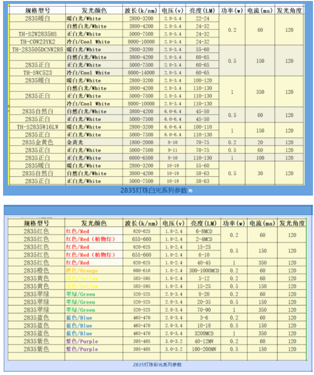 2835灯珠0.5w:白光/蓝光/翠绿光等 电压:2.8-3.4V之间,红光和黄光电压1.8-2.3V。电流150mA,白光光通量60-75LM。不同亮度可定做。