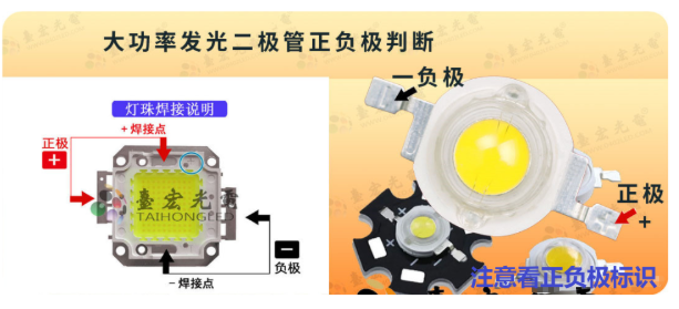 cob led灯珠正负极和集成大功率灯珠一样,正负极一般都标识在发光二极管的基板上,如下图。