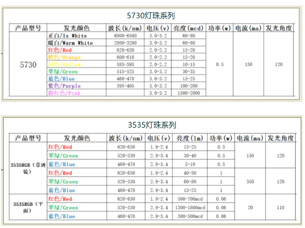 今天,我就把这些整理的型号参数分享给你,这些参数有的关于指示类,照明类和医疗美容类,有的关于汽车仪表,也有的用在商业照明上。