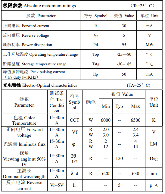 电流: 60MA 电压: R:2.0-2.2V W:3.0-3.2V
