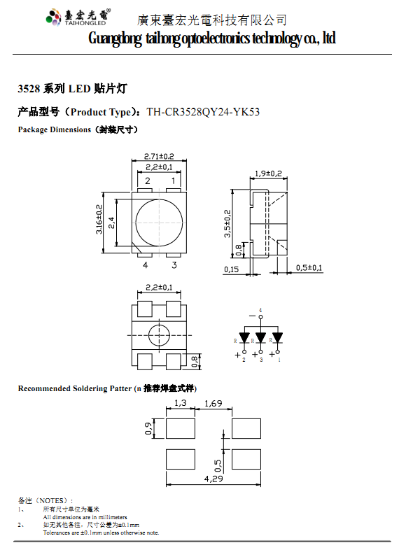 规格型号:TH-CR3528QY24-YK-53(4脚共阴)