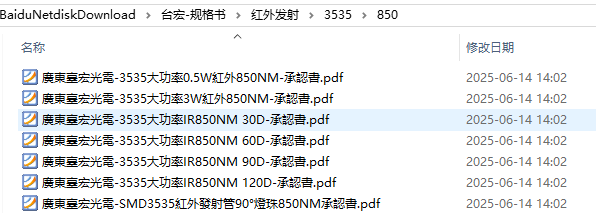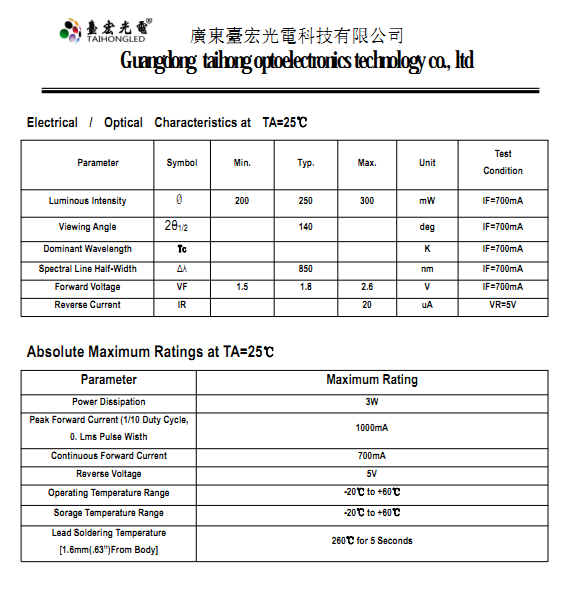 2、红外灯珠的技术参数表,主要包括波长、功率、角度、寿命、驱动电流、环境适应性、防护等级等。例如,台宏光电波长通常为850nm或940nm,红外灯功率范围从0.06W到5W不等,角度范围从30°到120°不等,寿命与环境和质量相关。此外,红外灯珠的驱动电流、光敏度、环境适应性也是关键参数。