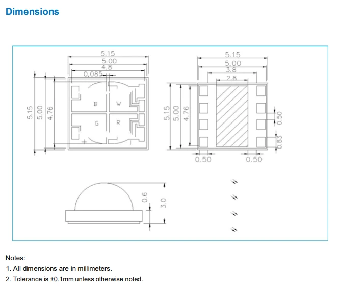 台宏光电仿流明大功率 RGBW 4W灯珠尺寸图如下: