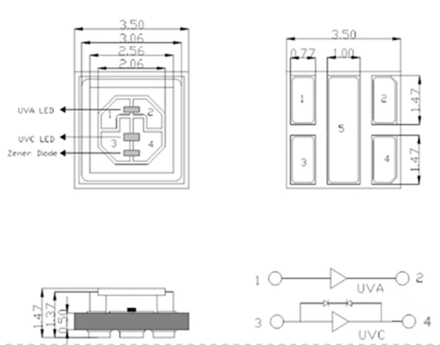 uv紫光led灯珠双波长灯珠尺寸图。